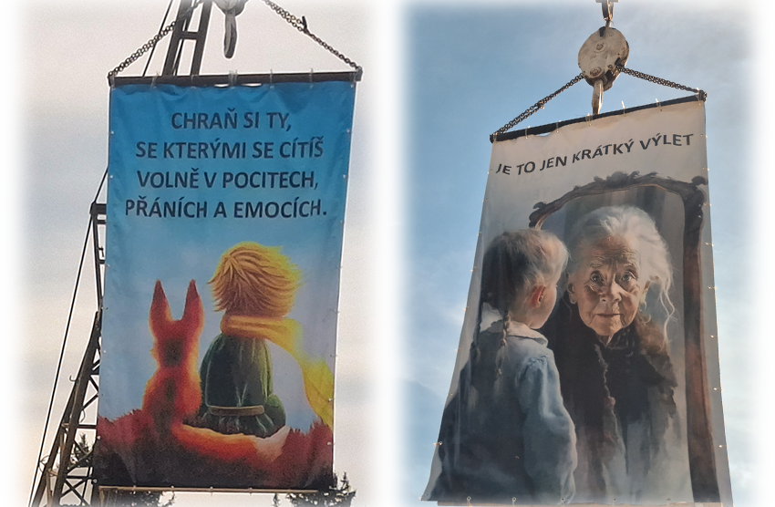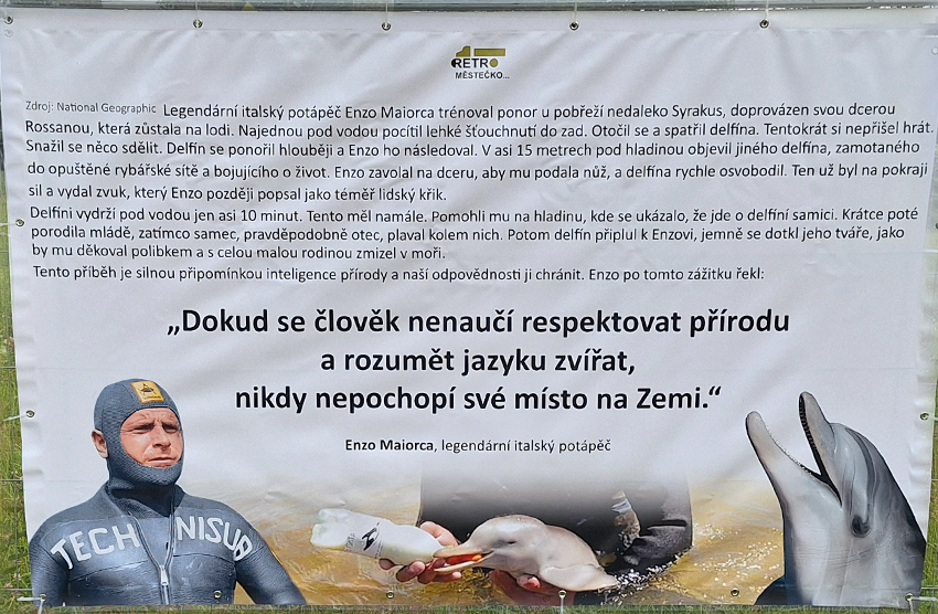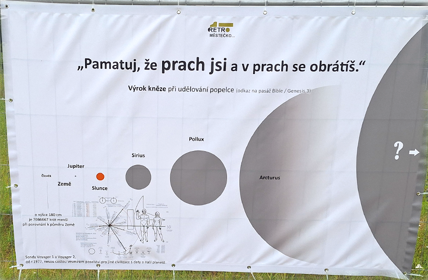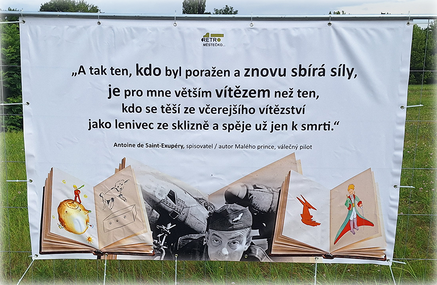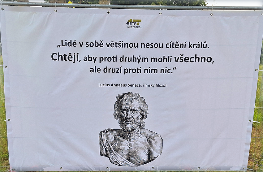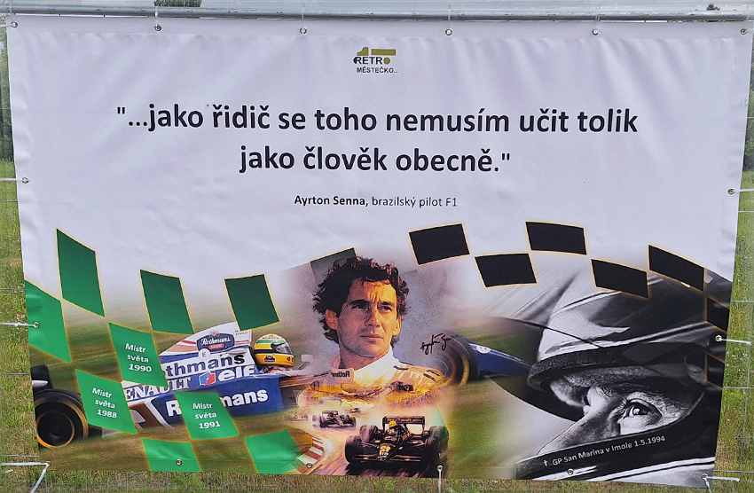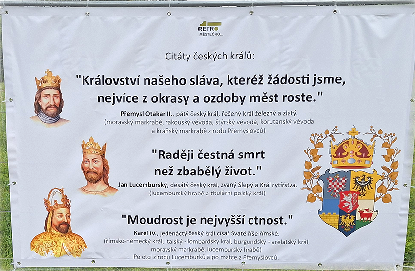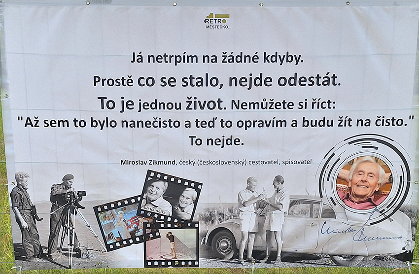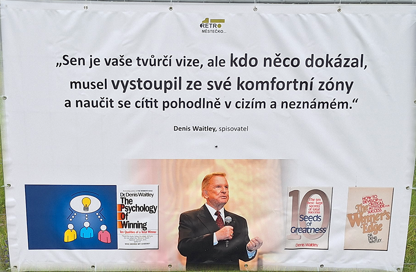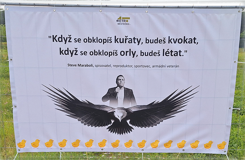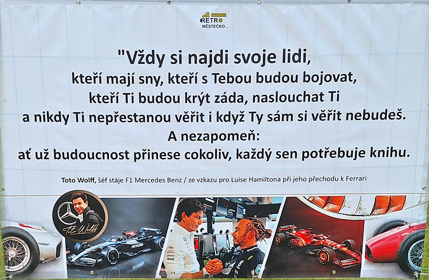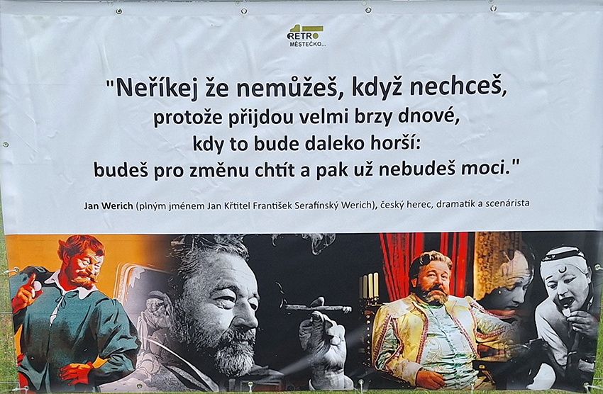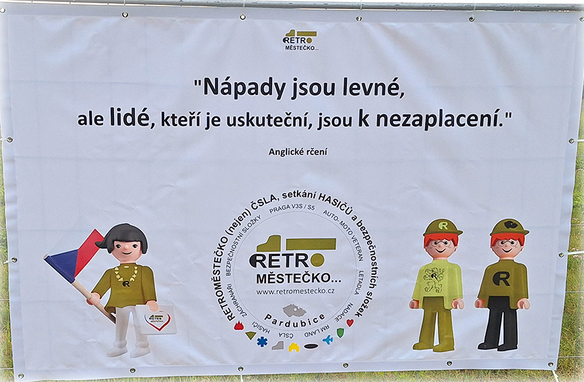 V areálu RETROMĚSTEČKA... jsme pro Vás připravili průchozí cestu mezi oběmi dynamickými arénami. Byla lemováne třinácti bannery se zajímavými životními slogany významných osobností. Další dva jsme zavěsili nad křižovatku cesty. Máme v plánu takto pokračovat i nadála a navyšovat. Kromě spousty techniky a akce v areálu, se tedy můžete chvíli pozastavit a zamyslet, třeba i se svými dětmi: